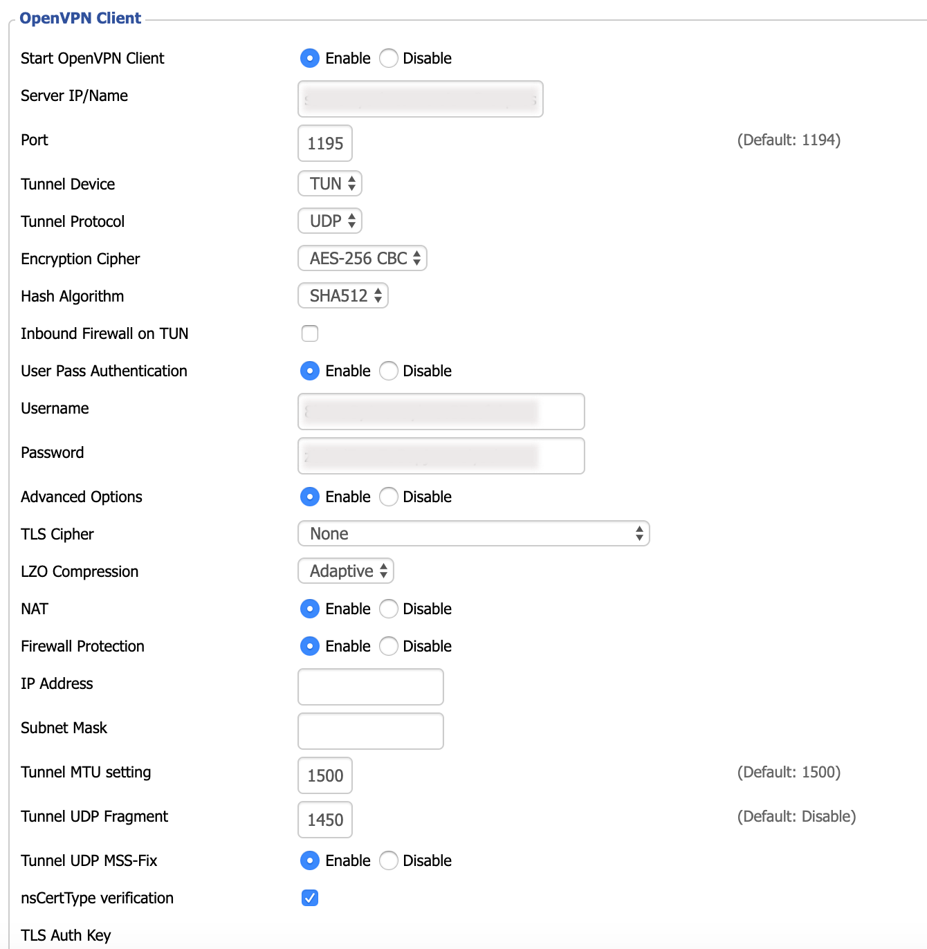 В разделе OpenVPN Client (Клиент OpenVPN) активируйте опцию Start OpenVPN Client (Запустить клиент OpenVPN). Откроется панель настроек OpenVPN.