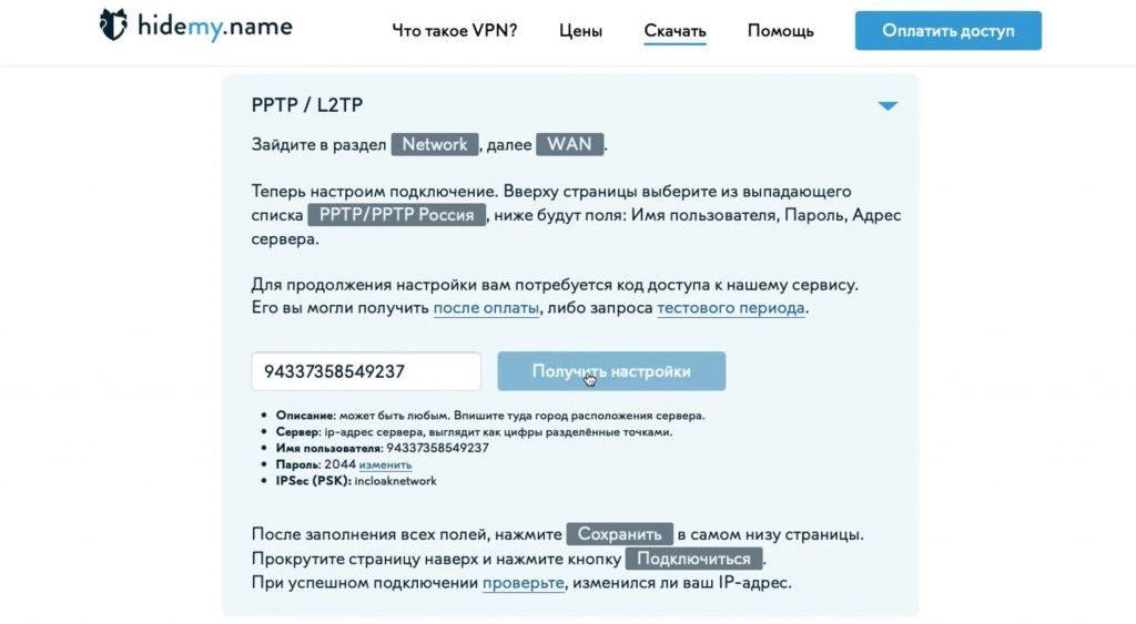 3. Заходим на сайт hidemy.name и в разделе загрузок находим свой модем для настройки. Например, TP-Link, далее переходим в раздел PPTP / L2TP, активируем и получаем код подтверждения. Вводим его в нужное поле, жмем «Получить настройки» и получаем все данные.