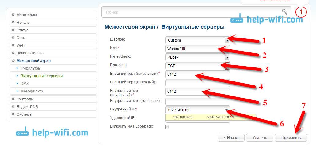 Перейдите в раздел Переадресация — Виртуальные серверы: