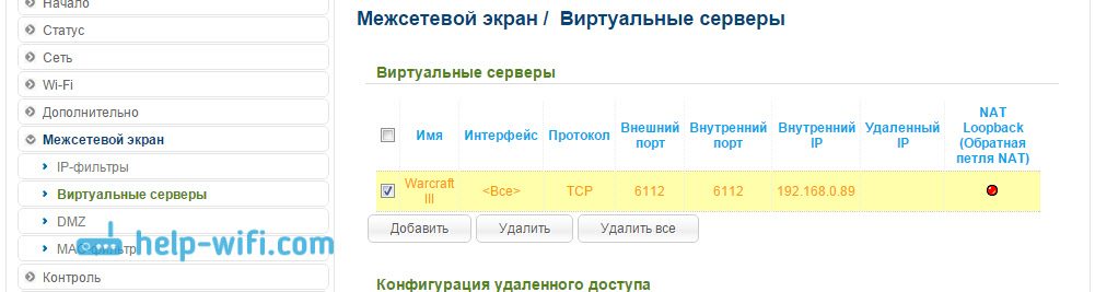 Вы увидите созданное правило, которое можно отредактировать (нажав на него), или удалить. Можно создавать новые правила для проброса портов, точно таким же способом.