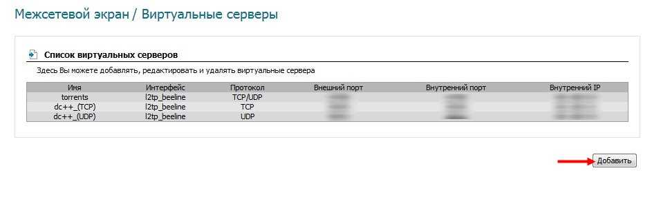 В настройках переходим на вкладку Межсетевой экран/Виртуальные серверы. И нажимаем на кнопку Добавить.