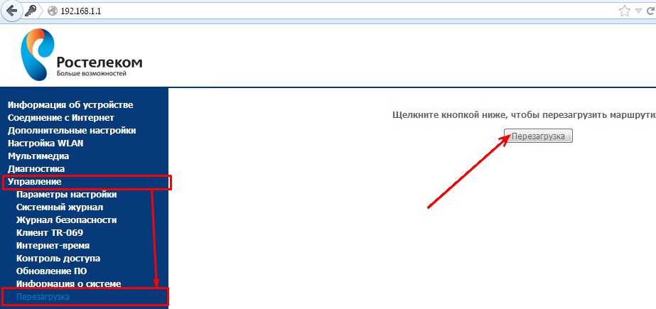 Обычно это модели Sagemcom f@st 2804 и 3804. Заходим в раздел «Управление», далее «Перезагрузка» и нажимаем на кнопочку.
