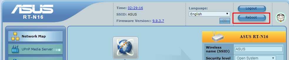 Будет проще перезапустить роутер Asus, какой бы новой у вас ни была модель. Кнопка всегда находится на самой главной странице, которая открывается сразу после ввода вашего логина и пароля. Затем на главной странице найдите кнопку «Перезагрузить», она может быть вверху или справа экрана.