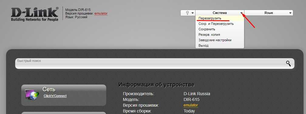 Перезагрузить D-link тоже просто. Войдите в админку и посмотрите на верхний ряд. Есть раздел «Система», кликните по нему, после чего небольшое меню будет удалено. В нем есть строчки «Сохранить и перезагрузить» и только «Перезагрузить». Первый используется, если в настройки были внесены какие-то изменения, а второй позволяет просто перезапустить Wi-Fi роутер.