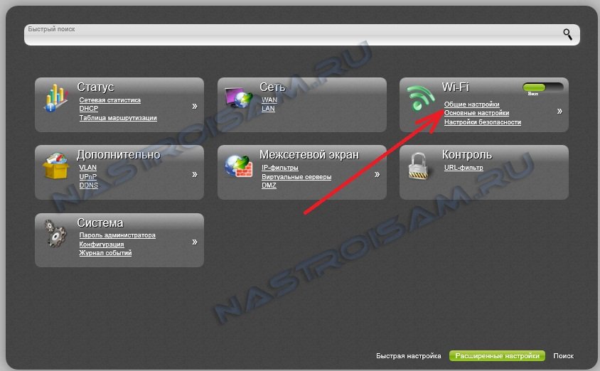 В меню расширенных настроек роутера выбираем раздел Wi-Fi > Основные настройки: