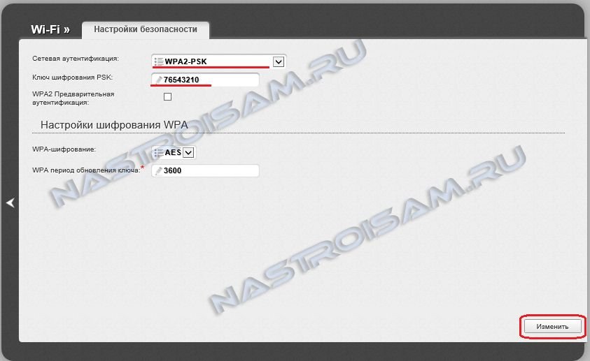 Тип шифрования выбираем WPA2-PSK, в поле Ключ шифрования PSK вводим ключ безопасности для создаваемой беспроводной сети. Он может быть любой буквенной, цифирной или смешанной последовательностью, не короче 8 символов. Нажимаем кнопку Изменить.