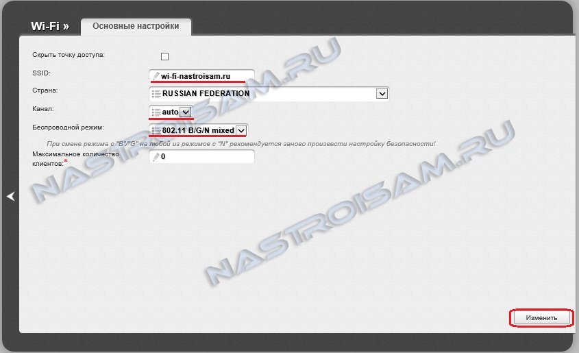 Здесь указываем идентификатор создаваемой беспроводной сети — SSID — им может быть любое слово на Ваш выбор в латинской раскладке. Канал оставляем в режиме auto, а Беспроводной режим — 802.11 B/G/N Mixed. Нажимаем кнопку Изменить.