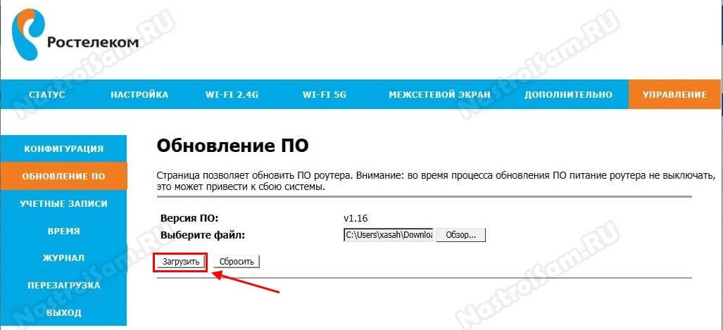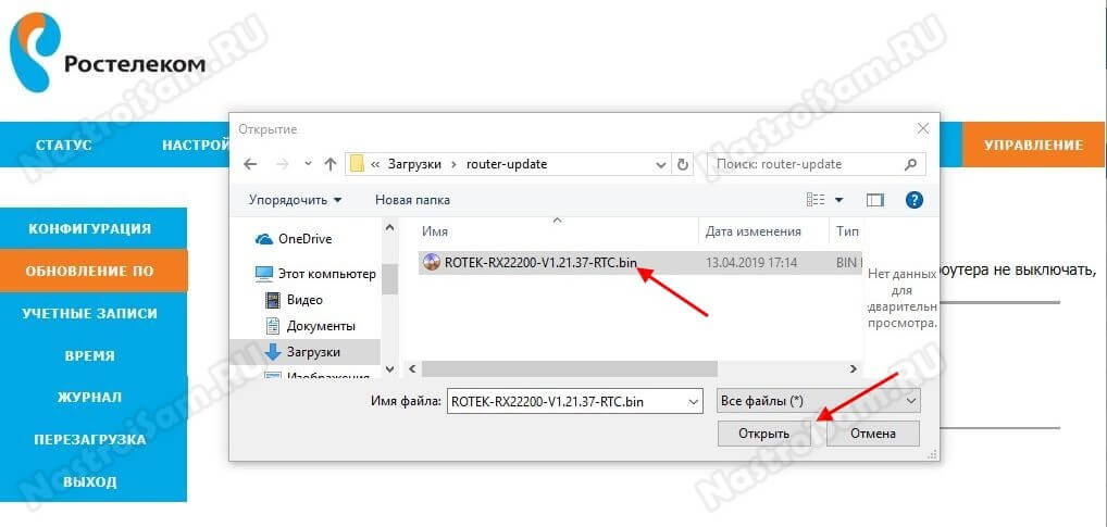 - Выбрать скачанный и распакованный ранее файл с прошивкой;