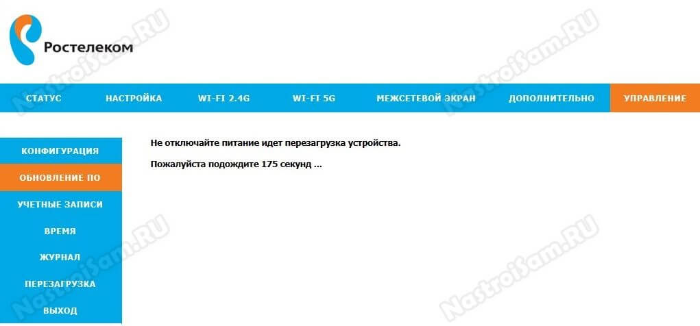 После этого операция перепрошивки перейдет в автоматический режим, пользователь дожидается переустановки ПО и перезагрузки роутера. После проверки вставших изменений можно подключить кабель Ростелекома в WAN-разъем.