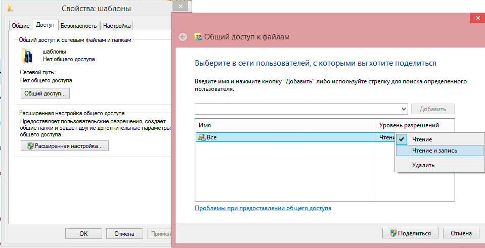 - Зайдите в меню «Общий доступ», затем «Расширенная настройка общего доступа», если это диск. Либо в подпункт «Все пользователи (чтение и запись)», если это папка.