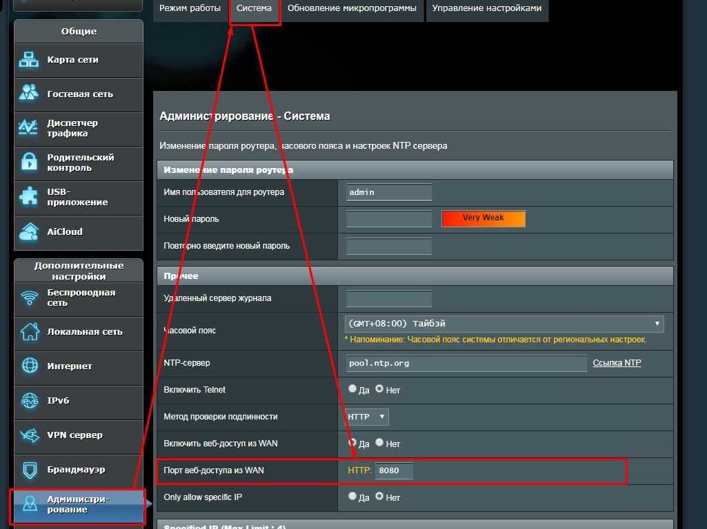 - «Администрирование» – «Система» – включаем порт веб-доступа и автоматом устанавливается порт.