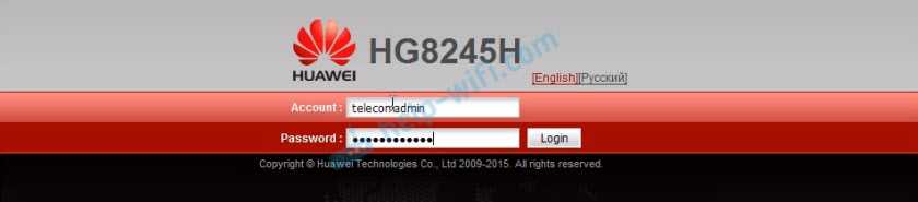 - В этом окне нужно ввести имя пользователя (поле Username, или Account) и пароль (Password). Возможно, на вашем роутере Huawei эта информация указана на наклейке (показывал на фото выше). По умолчанию это обычно следующие данные: Username (Account) – root, а Password – admin. Только это заводские данные, их могли изменить в настройках роутера. Например, мастер при установке и настройке оптического терминала.Если модем от провайдера Ростелеком, то в качестве логина скорее всего используется telecomadmin, а пароль admintelecom. Обязательно попробуйте. Если все хорошо, то должен открыться личный кабинет модема или терминала Huawei. Можно выполнить настройку Wi-Fi (WLAN) и т. д.