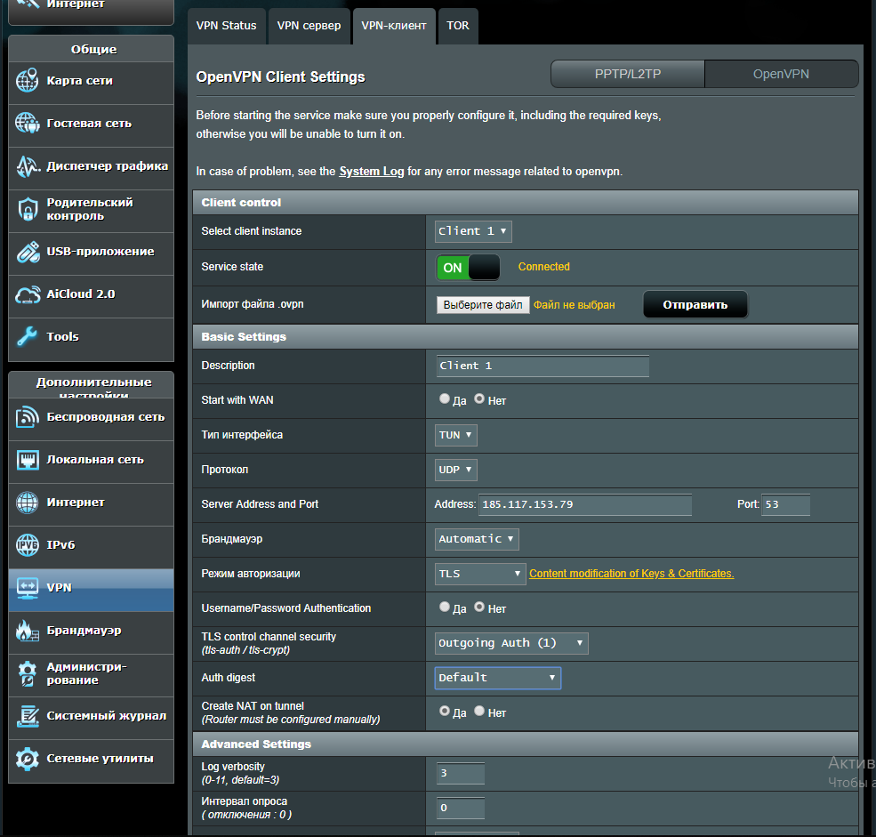 Если вы хотите, чтобы роутер работал как клиент OpenVPN, то проще всего загрузить файл конфигурации с настройками VPN. При этом самым удобным вариантом является файл конфигурации с встроенными в него сертификатами. Как это сделать написано .