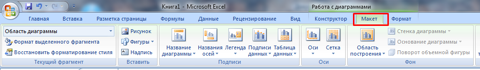 - Кликнуть по подходящему изображению, и в результате на листе появится готовый рисунок. Также на верхней панели будет доступен раздел «Работа с диаграммами» (конструктор, макет, формат).