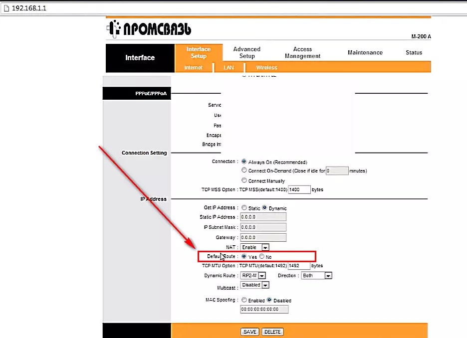 Жмём закладку Interface Setup. Попадаем в закладку Interface Setup и подзакладку Internet.