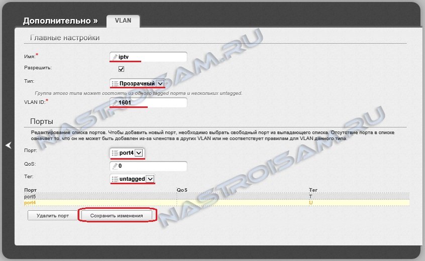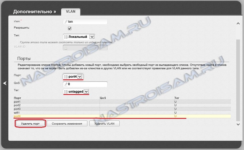 Здесь выбираем порт для приставки. Обычно это четвертый LAN-порт — port4. Нажимаем «Удалить порт», затем «Сохранить изменения».