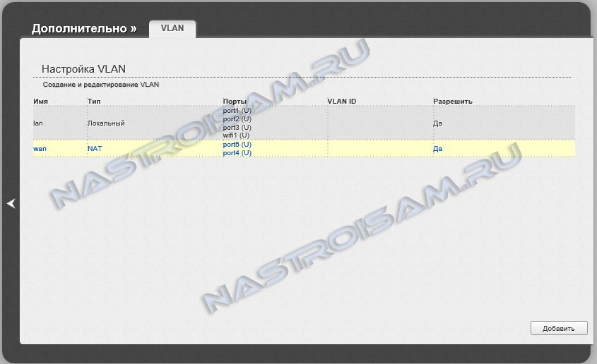 — вариант 2 — IPTV доставляется в тегированном виде — используется VLAN ID. При таком раскладе настройка чуть хитрее, но всё равно ничего сложного. В подразделе «Дополнительно» > «VLAN» кликаем мышью кнопку «Добавить».