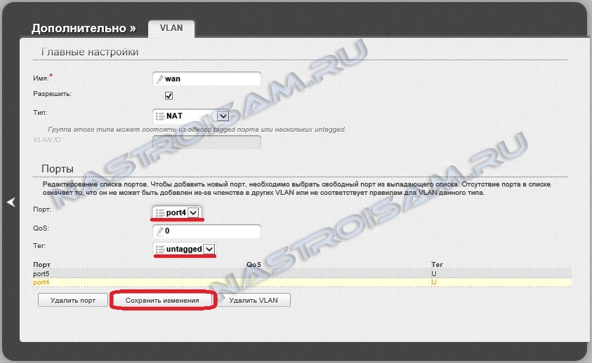 Здесь в поле «Порт» выбираем ранее отделенный port4, в поле «Тег» ставим значение «untagged». Нажимаем кнопку «Сохранить изменения». Этим мы делаем как бы параллельными WAN порт и 4-й LAN-порт. В итоге в таблице должно получится так: