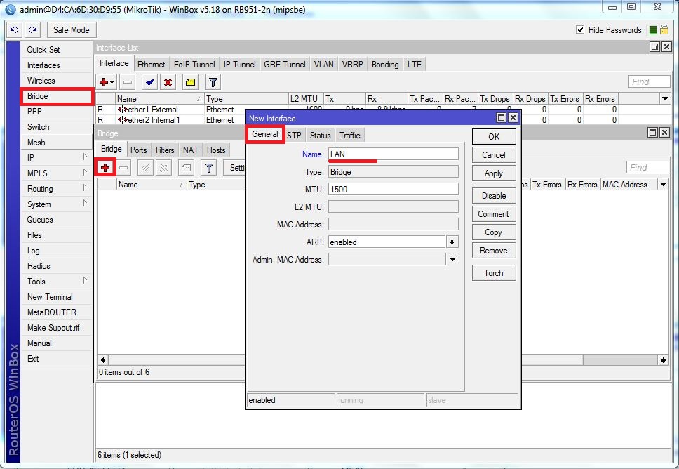 Если вы используете ADSL модем, к которому по сетевому кабелю подключен роутер MikroTik, сначала необходимо настроить ADSL модем в режим Bridge (мост).