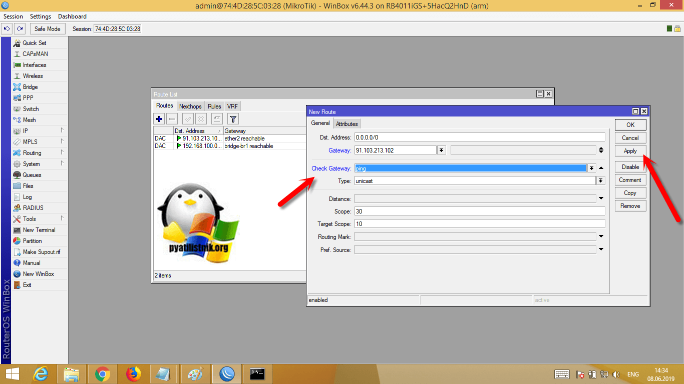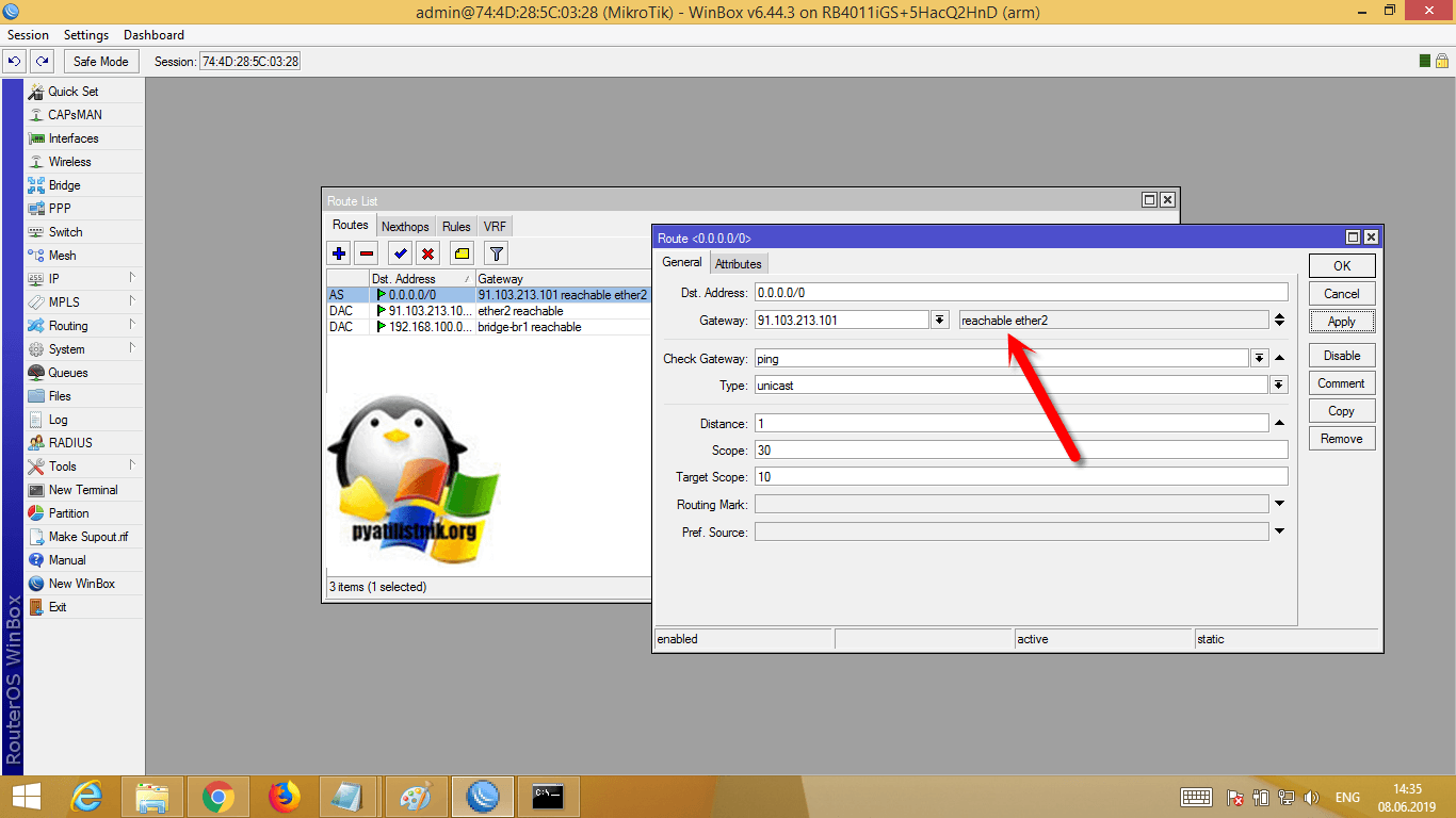 Видим, что у нас определился ether2 и состояние reachable, означающее, что все хорошо. Сохраняем наши настройки маршрутизации на роутере микротик.
