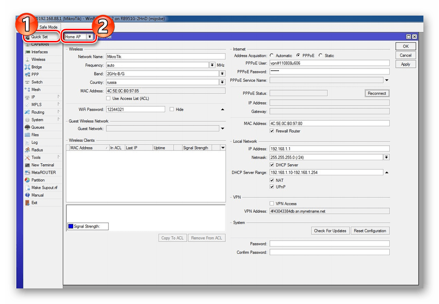 - В левом столбце окна утилиты Winbox перейти на вкладку «Quick Set».