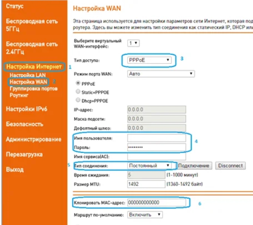 Переходим в раздел «Настройка Интернета» – «Настройка WAN». Вам нужно подсмотреть в договоре, какой тип подключения использует ваш провайдера, и указать его в строке «Тип доступа». Например, для PPPoE вам нужно указать имя пользователя и пароль. Остальные настройки оставляем по умолчанию.