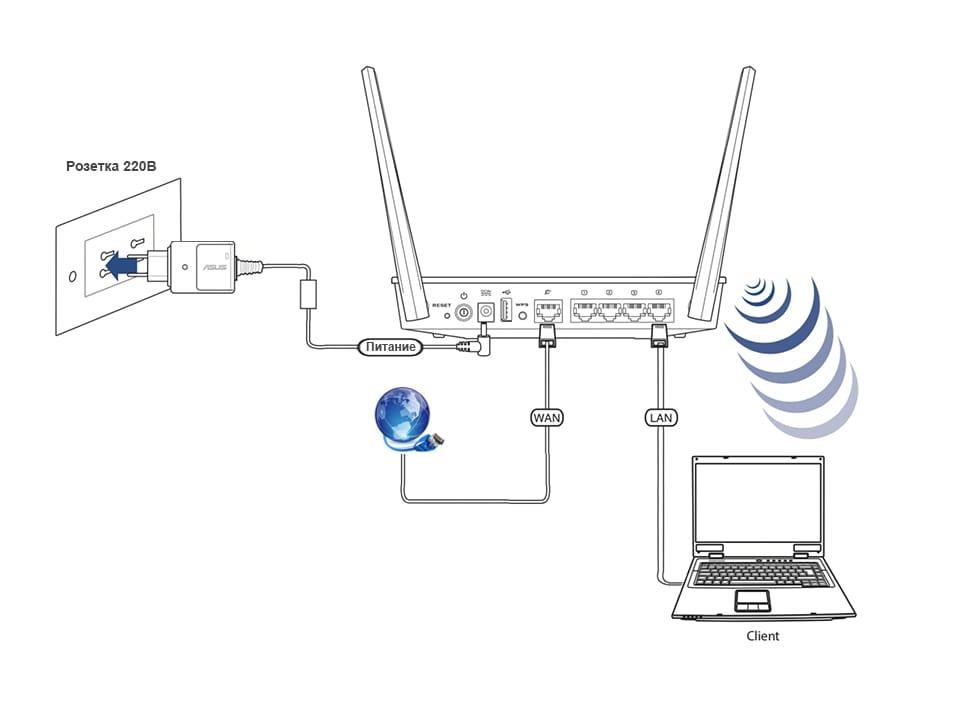 Для подключения роутера к Вашему Ноутбуку либо Персональному компьютеру (ПК) Вам необходимо подключить кабель, который Вам провел провайдер, к WAN порту роутер, а кабель, который шел в комплекте с роутером, один конец подключаем в один из четырех LAN портов, а другой конец подключите к Вашему ноутбуку либо ПК. И да, не забудьте подключить кабель питания.