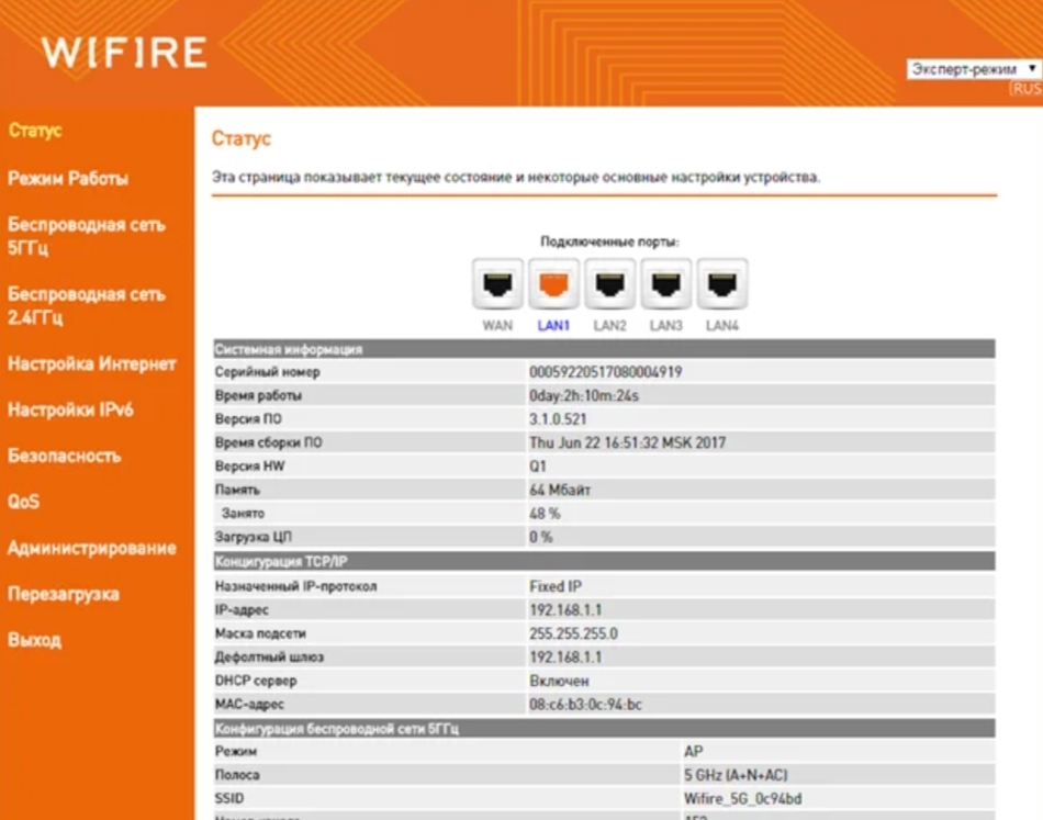 Роутер Fast Box является двухдиапазонный, это означает, что роутер поддерживает 2 рабочие частоты беспроводного соединения, это 2,4 ГГц и 5 ГГц. 5 ГГц позволяет добиться более высокой пропускной способности, но обладает меньшей дальностью действия чем 2,4 ГГц, 2,4 ГГц более подвержена помехам. 5 ГГц поддерживается далеко не всеми устройствами.