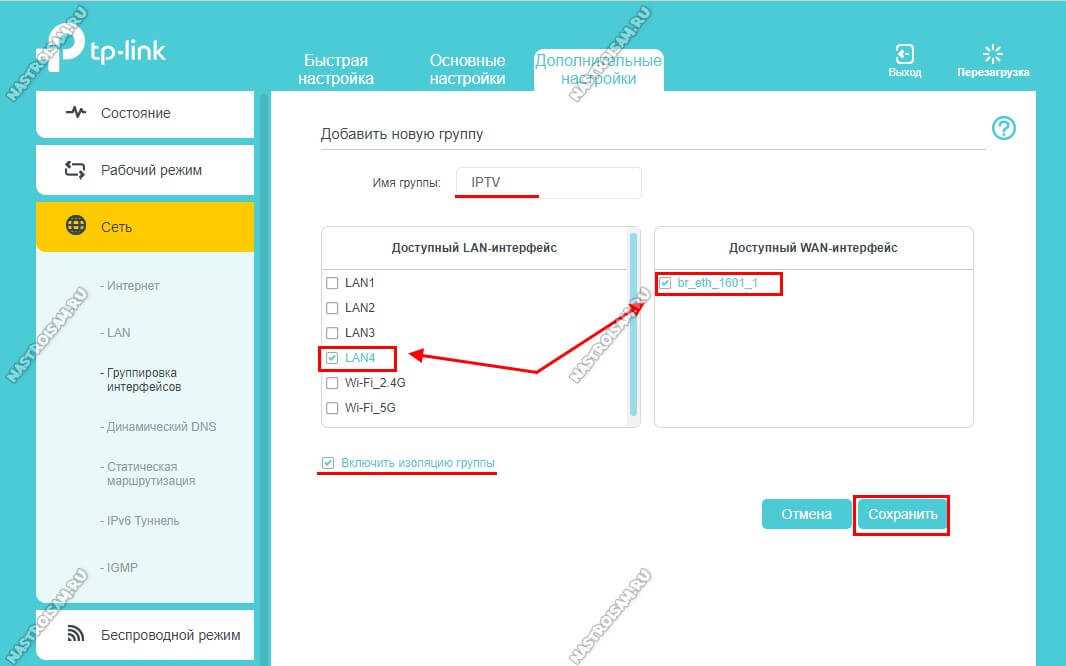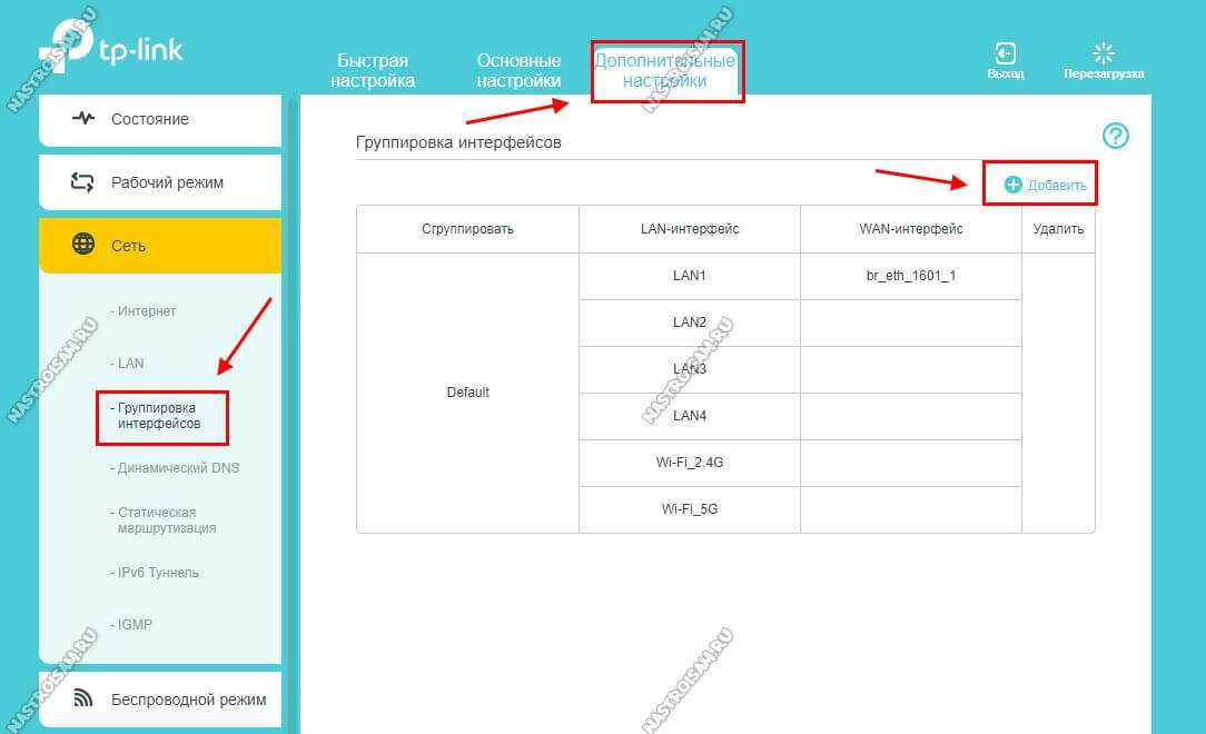 После этого переходим в раздел «Дополнительные настройки» → «Группировка интерфейсов» и нажимаем кнопку «Добавить».