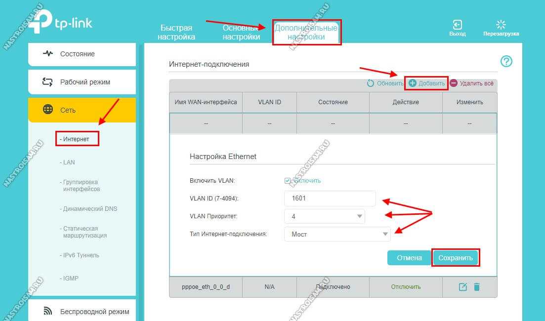 Вай-Фай роутер ТП-Линк Арчер С20 умеет работать с виртуальными сетями Vlan и позволяет без особых проблем подключить интерактивное телевидение от Ростелеком, Билайн или Дом.ру. Для этого зайдите в раздел меню «Дополнительные настройки» → «Сеть» → «Интернет». Так Вы откроете список WAN-соединений и там уже будет одна строчка созданного ранее Интернет-подключения. Для IPTV надо создать ещё одно — нажмите кнопку «Добавить».