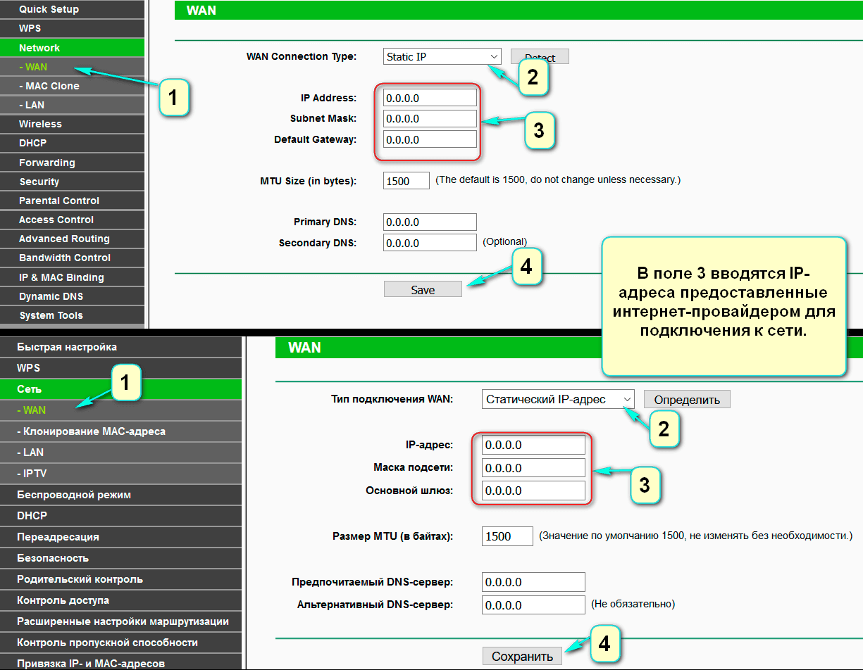 Указываем в типе подключения “Статический IP-адрес” (Static IP) и вводим IP-адрес (поле под цифрой 3 на рисунке), который вы узнали в техподдержке провайдера. Затем также сохраняемся кнопкой “Сохранить” (Save).