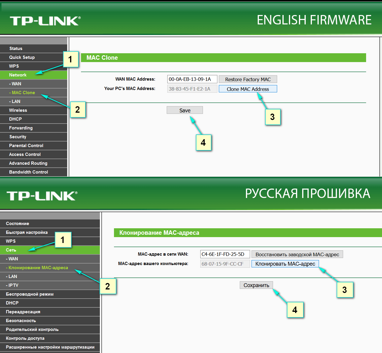 Выберите пункт в панели управления “Сеть – Клонирование MAC-адреса” (Network–MAC Clone), и там уже нужно нажать надпись “Клонировать MAC-адрес” (Clone MAC Address)