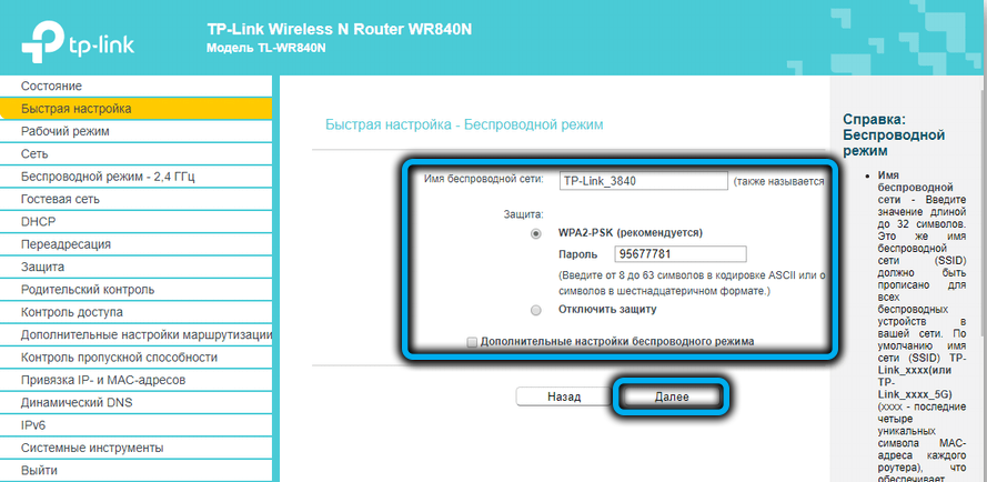 На этом настройка не закончена. После того, как вся введенная информация сохранится в системе, смените пароль от сети. Придерживайтесь инструкции: