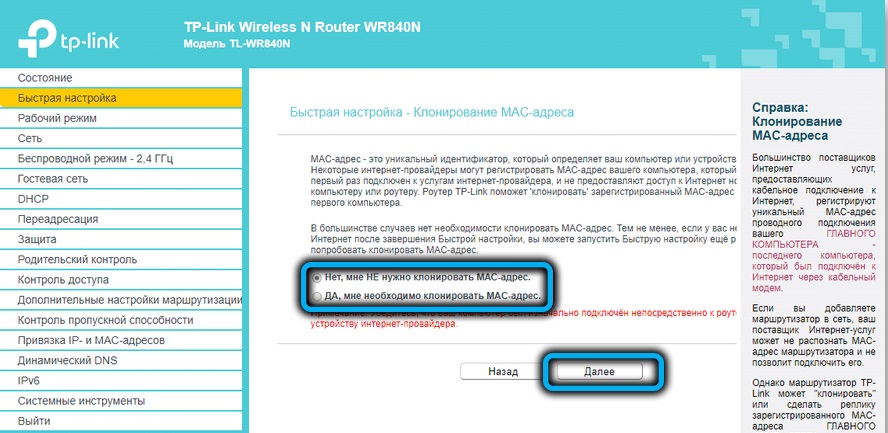 - НЕТ, мне не нужно клонировать МАС-адрес. (No, I do NOT need to clone MAC address.)