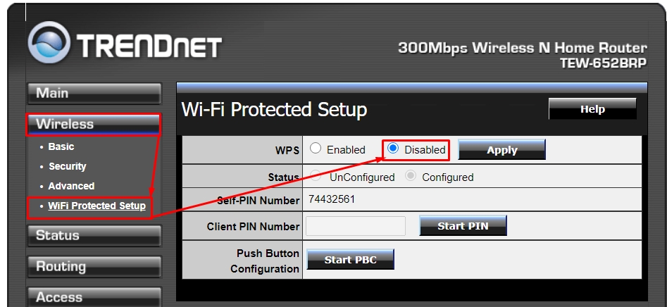 Ставим галочку WPS Disabled и нажимаем кнопку Apply (Применить).