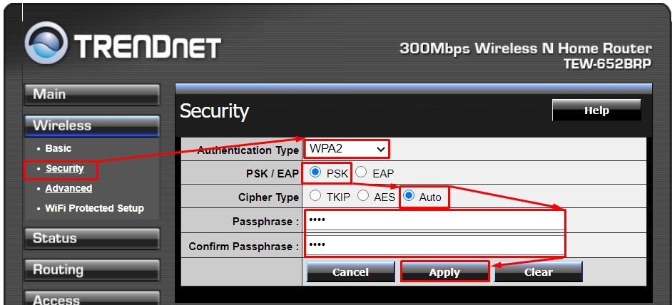 Теперь нам потребуется обезопасить беспроводную сеть, чтобы к ней подключались лишь те пользователи, кто знает ваш пароль. Для этого в левой области окна открываем подвкладку «Security». Заполните следующие графы: