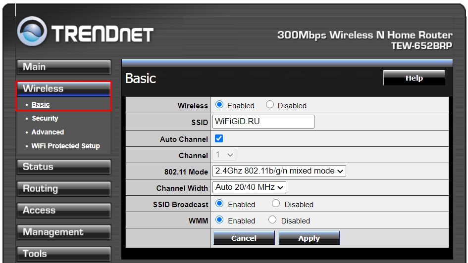 Когда настройка интернета на роутере будет завершена, вам остается лишь обеспечить доступ к беспроводной сети, то есть мы переходим к настройке Wi-Fi. Для этого в блоке «Main» пройдите ко вкладке «Wireless», а чуть ниже выберите подвкладку «Basic». Здесь вам потребуется заполнить следующие графы: