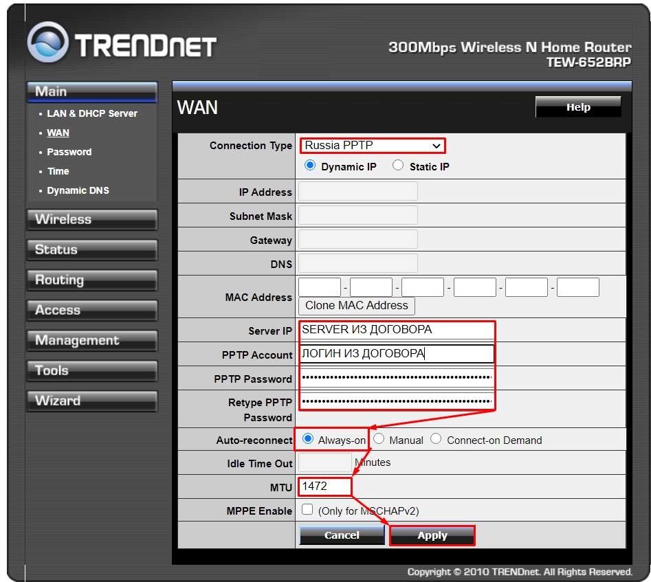 Вводим логин и пароль в строки «User Name» и «Password» (повторяем пароль в «Retype Password»). В строке «Auto-reconnect» ставим постоянное подключение «Always-on». И устанавливаем MTU как 1472. «WAN physical setting» устанавливаем «Static IP», если в договоре есть настройки IP, маски и шлюза.