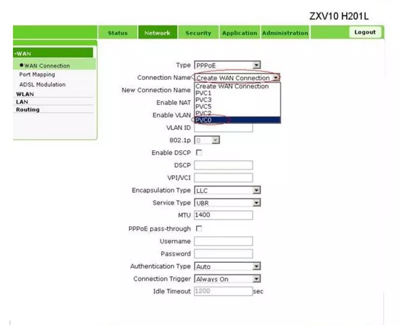 В меню WAN Connection в строке Connection Name выбирается PVC0, а в строке Type устанавливается Route.