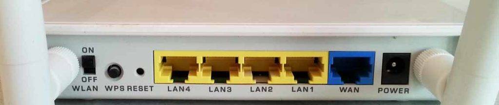 На задней панели устройства расположены четыре LAN-порта для подключения пользовательских устройств и один WAN-порт, предназначенный для соединения с сетью. Подключаем кабель провайдера или патч-корд от ADSL-модема к порту WAN.