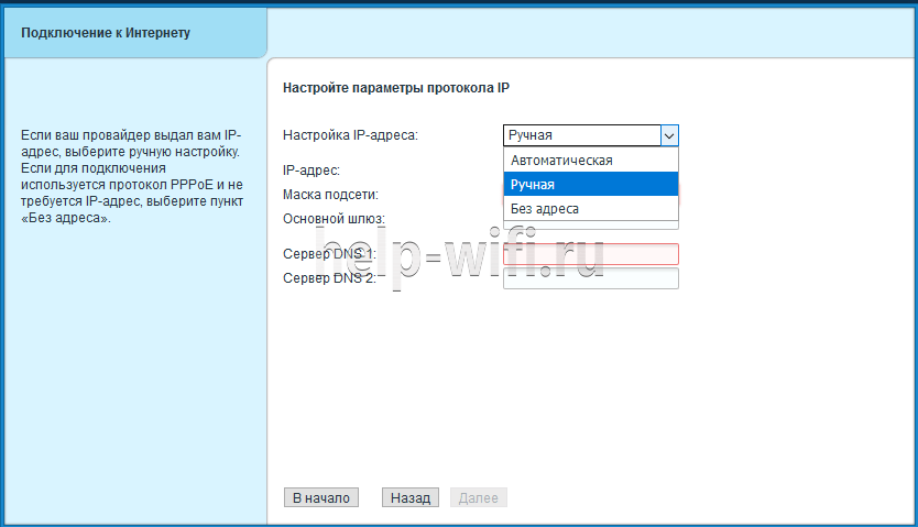 Первый шаг в этой инструкции – тоже настройка MAC-адреса. После этого нужно выбрать конфигурацию IP-протокола. На выбор нужного варианта здесь тоже влияет то, как провайдер присваивает сетевой адрес пользователю внутри своей сети. Если по DHCP, то выбрать нужно пункт «Автоматическая». Если же адрес статический и он известен, выбрать «Ручная» и заполнить следующие три строки:
