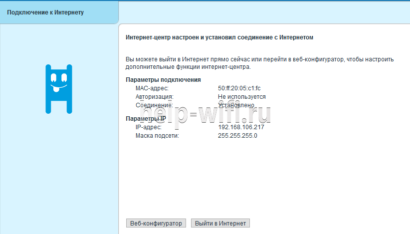 После этого достаточно нажать кнопку «Выйти в интернет» на экране, суммирующем все проведённые настройки и, если ничего больше не мешает подключению, у пользователя будет связь с сетью.