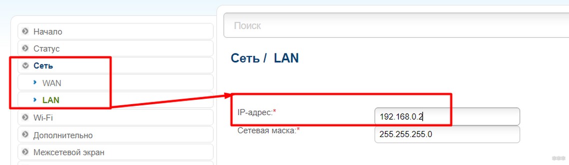 Вы должны изменить IP-адрес второго маршрутизатора. Для этого в левом меню выберите раздел «Сеть» и чуть ниже него — «Локальная сеть».