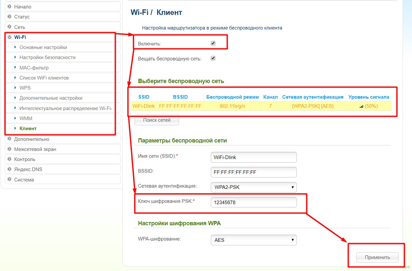 - Далее в «Wi-Fi – Клиент» активируем галку «Включить», выбираем доступную сеть, вводим ключ шифрования PSK (пароль от сети, к которой подключаемся):