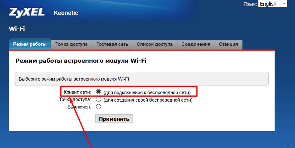 Еще один представитель, который нам нужно покорить. Главное здесь – что все находится на поверхности. На примере Keenetic. Щелкаете внизу по Wi-Fi и на первой же вкладке с «Режим работы» выбираете нужную нам «Клиент сети», а далее уже все как по накатанной: