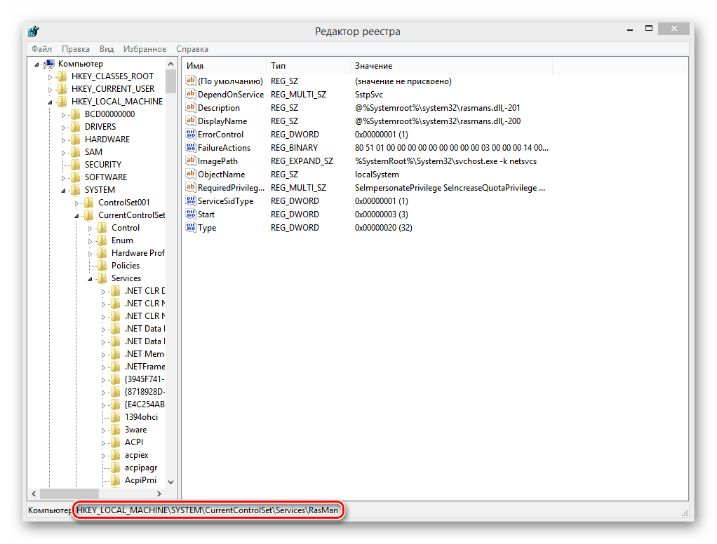 - Отыщите категорию HKEY_LOCAL_MACHINE – SYSTEM – CurrentControlSet – Services – RasMan.