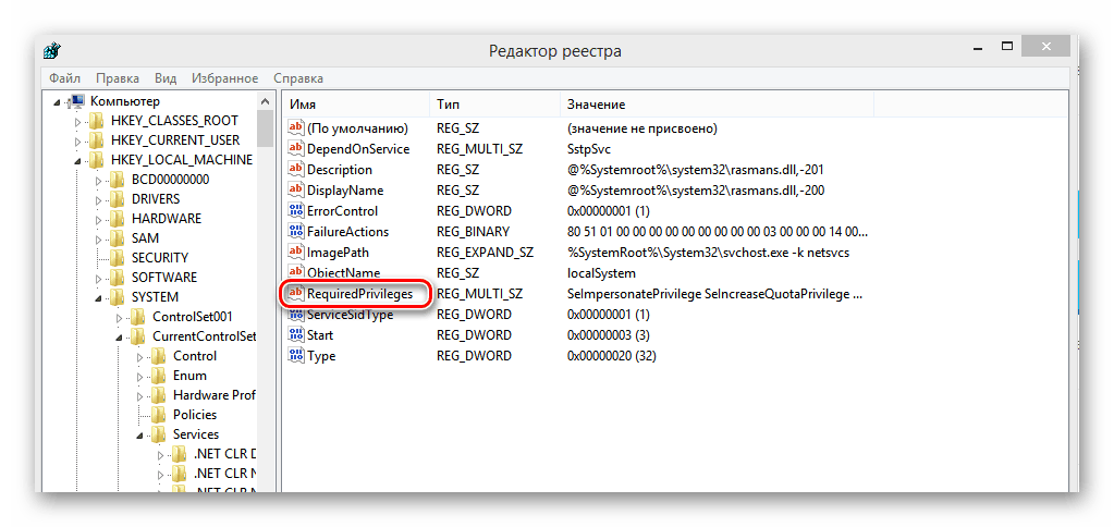 - Выделите строчку «RequiredPrivileges» и два раза кликните по ней.