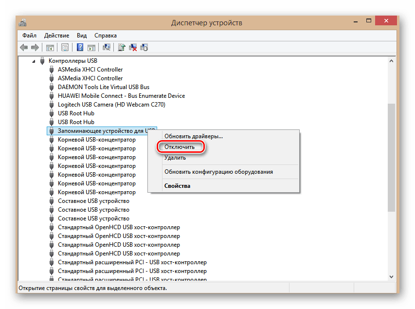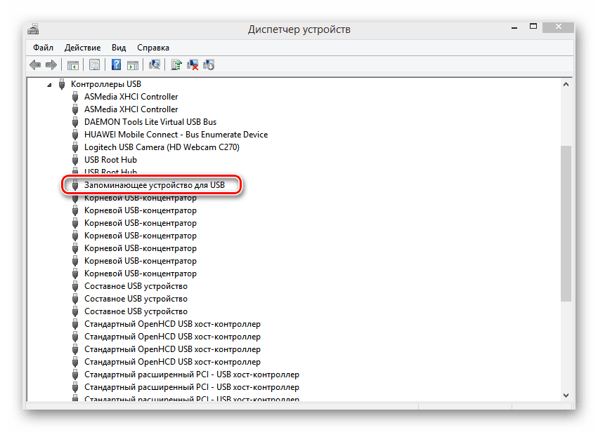 В открывшемся списке ищем параметр «Запоминающее устройство для USB».