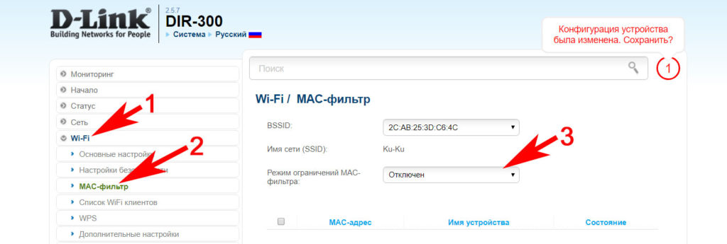 Проверьте не настроен ли у вас MAC-фильтр на маршрутизаторе. Войдите во вкладку «Wi-Fi», «MAC-фильтр», далее в строке «Режим ограничений MAC фильтра» выберите «Отключен». Это для того чтобы любые устройства могли подключаться к беспроводной сети.