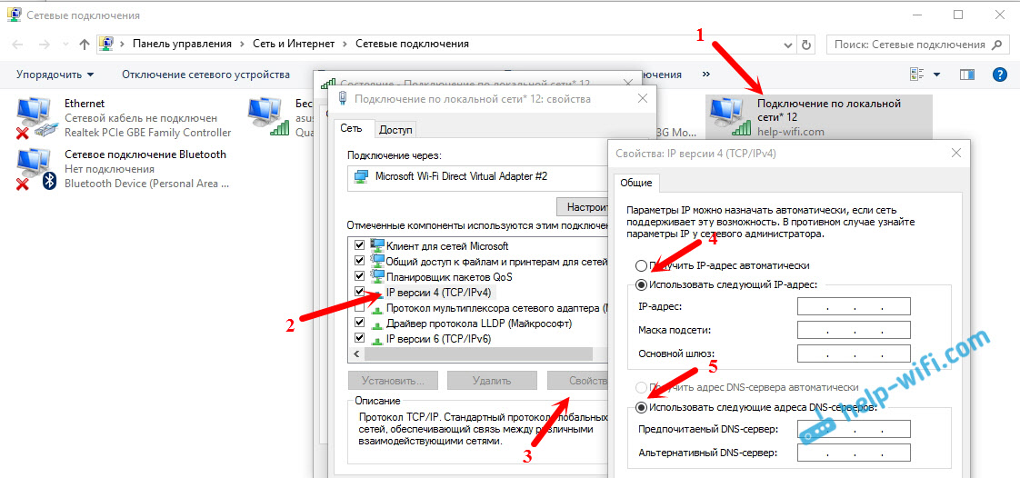 Или наоборот, если там будет автоматическое получение адресов, а проблема с подключением наблюдается, то попробуйте прописать адреса вручную. Как на скриншоте ниже. DNS можете попробовать не прописывать. Главное IP-адрес и Маска подсети.